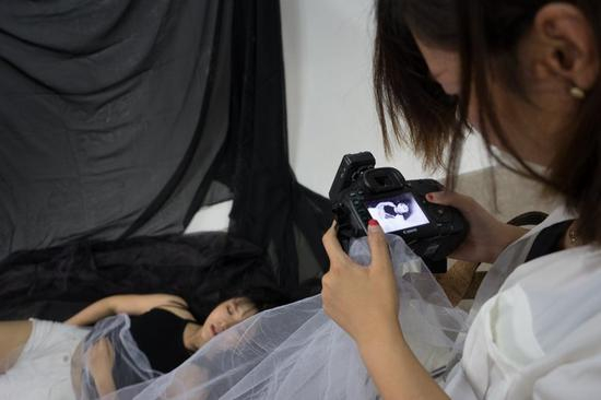 变换一下视角进行拍摄也是个不错的选择,可以利用选择的墙前面的地板或者床让模特躺下,来进行俯视拍摄。俯拍的时候也建议利用上述所说的前景,薄纱 可以让模特压住下端一部分,上端让摄影师还是放在镜头前,这样拍出来会有透明程度不一样的层次,制造一些纵深空间和朦胧感,让情绪在画面呈现上有更多的释 放。