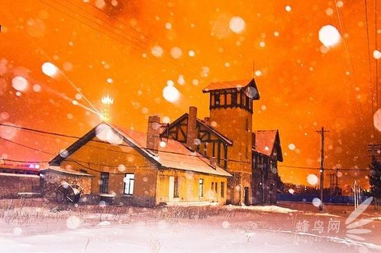 夜色中的阿尔山火车站,大雪纷飞。焦距35mm,光圈F6.3,快门1/6秒,ISO 2200,对火车站屋顶测光对焦,减曝光一档,强制闪光灯,手持,一次成像。