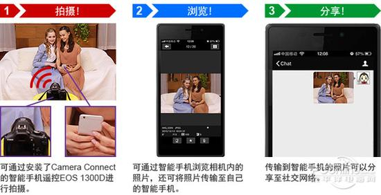 佳能EOS 1300D支持通过Wi-Fi功能使相机与智能手机联动,向自己的智能手机传输照片,将照片发送给朋友、家人,或是上传至社交网络分享。此外,还可以方便地使用智能手机遥控操作相机。