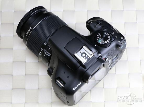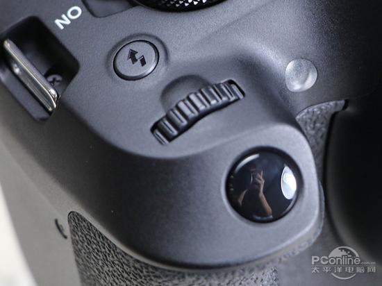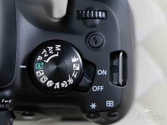 相机的顶部左起分别是扬声器、热靴、模式拨盘、电源开关、闪光灯弹出键、拨轮以及快门键,因为是一款入门相机,全机只设置了一个拨盘,也取消了不少自定 义键,一定程度上会影响快捷操作。拨盘不能整圈旋转,视频功能也集成在模式拨盘里,边拍照边拍视频时要在拨盘里转过一定距离,切换有些麻烦。