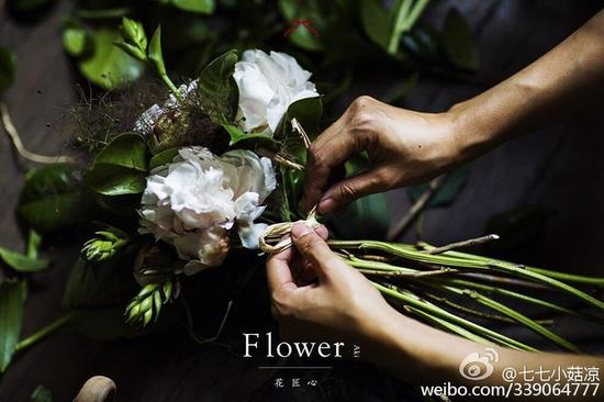 a、一个俯身,刘海微微掉下,眼神坚定。花艺师女友正在努力工作,这一点从她的神态和动作上都能体现。