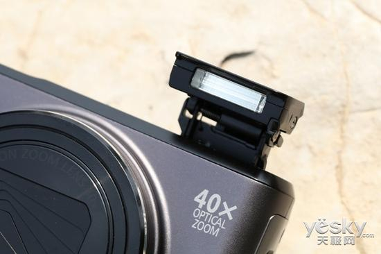 佳能PowerShot SX720 HS的机身顶部设有弹出式内置闪光灯,用户可以通过侧面的唤起拨杆将闪光灯弹出。