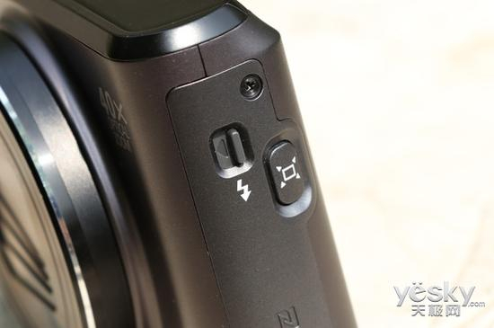 在佳能PowerShot SX720 HS机身的侧面,我们可以看到NFC标识和佳能独有的对焦查找按钮。