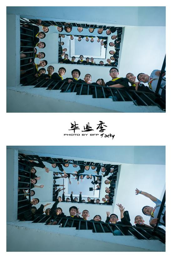 摄影师选择拍摄场地的时候,要了解清楚拍摄者喜欢的风格,如果可接受不拘束的拍法,那么完全可以更加天马行空一些,借助特有的地形拍摄创意集体照。像上图的楼梯大合照拍法就让人耳目一新,既拍清楚每个人的脸,也使画面动感丰富,有空间设计感。