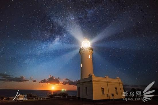 再举一个例子,《灯塔之光》这张照片拍摄前已经做好周密计划,拍银河的同时想拍到月升,就要综合三个条件,夜空无云,银河方位角度及月出的时间。并需要 在灯塔的光束转动时拍摄三张不同方向的光芒,后期合成。由于月出时间每天相差约一小时和银河的方位时间变化,在南半球想同时拍到银河与月出只有在冬季,每 个月大约只有几天的机会,还要配合晴朗的夜空,六月初的周末天公作美成就了下面这张照片,银河月亮灯塔相映成辉。