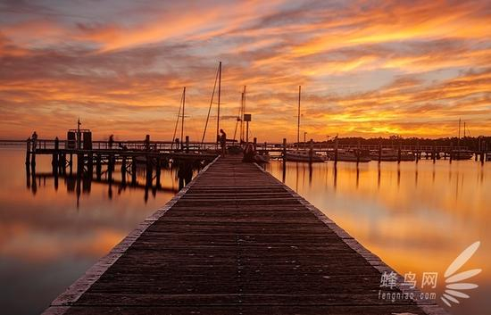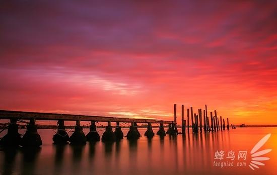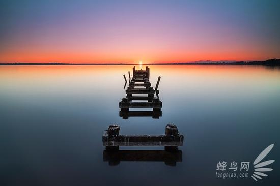 比如不同季节日出方位有极大不同,下面这张照片在冬天日出的方位恰好在栈桥的中间,成就了画面的平衡与对称,如果是夏天拍的话,日出角度相对冬季已偏东约 60 度,实现不了这种构图。