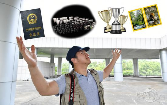 在外形上,“大湿”一件卡其色的国家摄影师协会订制的摄影马甲,佩戴上哪一颗闪亮亮的中国摄影家协会勋章,一双海陆空通用的登山鞋,头戴一顶军绿色,卡 其色的渔夫帽,口袋中有意无意露出一本国家摄影师协会的会员证,在微博、微信等平台上刊登着一堆获奖头衔,加V通过官方认证。