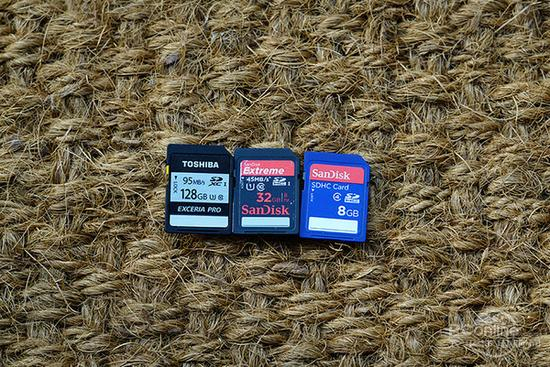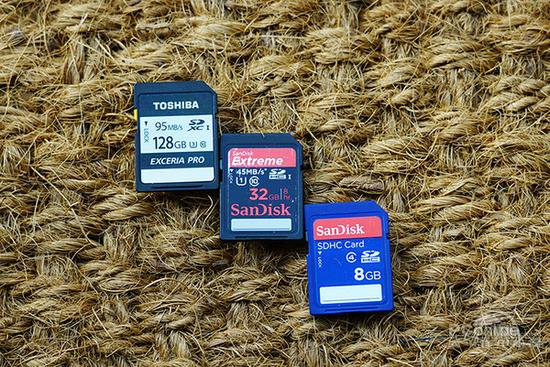 鉴于符合条件的存储卡种类太多,不可能一一测试,因此我们分别挑选TOSHIBA 128G EXCERIA极至瞬速SD卡、SanDisk 32G Extreme至尊极速SD卡和SanDisk8G蓝卡分别代表高速大容量的高性能卡、普通读写速度的中等容量卡和低速小容量的的使用情况来进行问题说明。