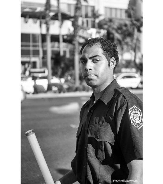 还是在拉斯维加斯,主人公是一个指引车辆和行人的保安,我本来已经走过了他,但最后还是决定回去给他拍一张。在和他对了对眼又点了点头后我按下了快门,后来他对我说:“我还没来得及笑呢”。