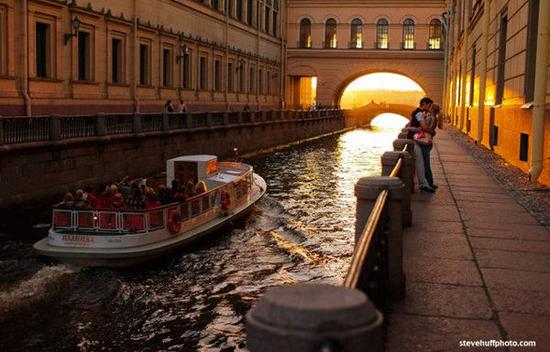 摄于俄罗斯圣彼得堡,时间是午夜(当时接近极夜)。看到这对情侣在午夜的阳光下亲吻,身后还缓缓驶过一条游船,我毫不犹豫地按下了快门,这张照片完美地捕捉到了属于这座城市的浪漫。