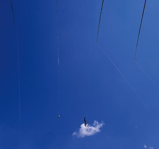 抬头看到天空垂钓的鱼竿,总觉得过于单调,眼前不停飞来飞去的海鸥落入我的视线,他们也在等待捕捉着自己的午餐。这些在水中游弋着的可怜的小鱼们,它们 的周围布满诱饵,空中的海鸥等着它们的疏忽。一个念头浮现在我脑海中,让鸟和鱼竿组成一个风景吧!我选择一朵白云为背景,等待快速飞翔的海鸥经过。我渴望 海鸥能进入白云的中间,可是并不是都那么如意,这也证实了“理想很丰满,现实很骨感”这句话。