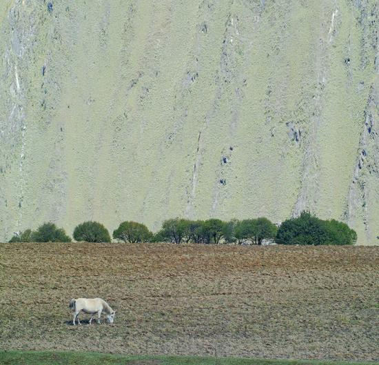 在四川的青藏高原边缘行走,沿途会经过许多断裂带和河谷,这些地点都是摄影人的拍摄点。当看到洁净的背景时,把一匹马纳入镜头就构成了一个简单而优美的画面。