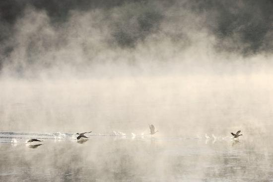 2007 年 2 月,我一个人去西藏。第一次进藏的我心中对这片神奇的土地有着无限的憧憬,去之前我的脑海中就装满了西藏的苍茫大气、如歌如画的美妙,乃至心中老想着怎么 拍出一种壮阔恢宏的风光。当太阳洒在冬季的拉萨河,河中的热气升腾着,在地面附近形成一层白雾,画面底部是一群麻鸭在河水中嬉戏着。假如仅仅用超长焦拍摄 下方的麻鸭,得到的就是生动活泼的动物。此时涟漪耀眼,假如用超长焦拍摄画面左上角飞翔的两只麻鸭,也能得到一幅动态不错,飞翔姿势有些拙笨的鸟儿。这两 种拍摄方式都缺少留白,画面中主体占去大部分的画面,这样就会使人感到气闷和闭塞,更感觉不出飞翔的自由和任性。