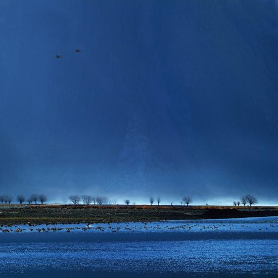 倘若上方没有两只麻鸭飞过呢?留白就有可能转化为苍白。画面中的留白部分和主题必须有因果关系,这种因果关系必须是读者所熟悉的,如白雪皑皑中的一只奔 跑的北极熊,假如你拍摄成四周大面积留白的画面,读者立刻便能联想到那儿旷野的巨大和寒冷。能用作品来告诉别人你的感受说明你拍摄成功,这也是摄影师的必备能力。