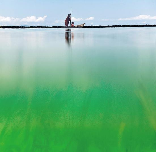 把相机装上防水套之后,相机就可以没入水中拍摄,这张照片拍摄的要点是相机的镜头一半露出水面,一半沉入海水中,因此对海水和天空同时曝光,上下不同的世界呈现在同一照片中,简洁而有变化。