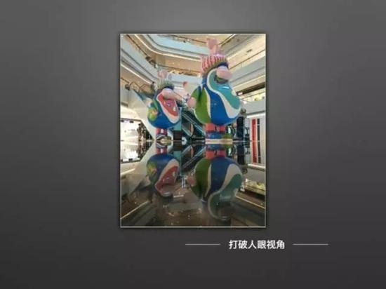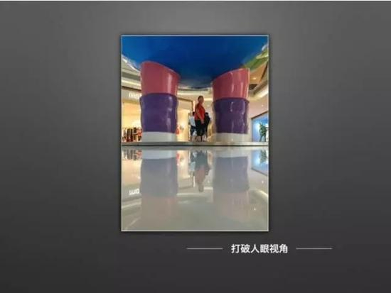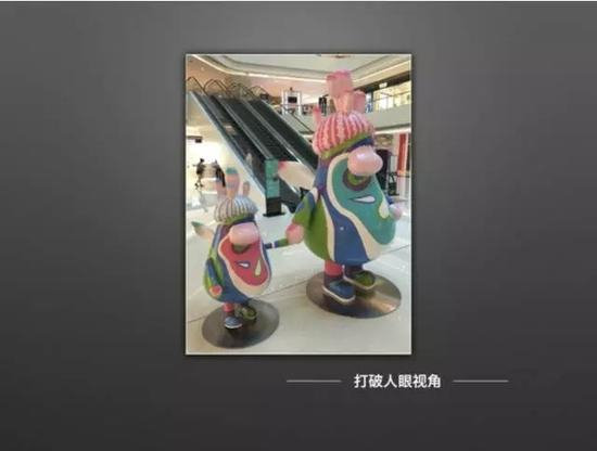 这张照片是以人眼高度拍摄于商场的两个公仔。这样的观察方式对于我们是不新奇的,我们人眼看过去就是这样的景象。如果我们打破这种取景,结果会怎样呢?