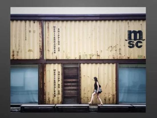 这一张照片同样是一张黄色和蓝色作为画面主色调的一张照片。从色彩构成的角度来说,这样的一组互补色,给画面提供了一种非常鲜明的色调。另外,画面的主 体,也就是这个人正在尝试做一个跨越的动作,正是这样一种略带不稳定因素的动作让整个画面展示出一种张力。因此,主体作为画面的视觉中心,并没有被背景的 两种对冲强烈的颜色缩削弱。