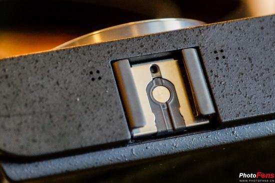 机身正面的右上角为显著的“yi”Logo标识,并以红色打底。小蚁M1相机顶端设计了热靴,相机并没有内置闪光灯,热销为单触点。