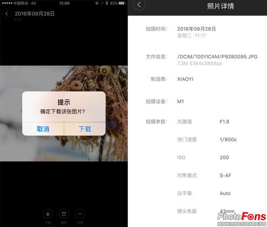 连接成功后,可以在手机上看到储存卡中拍摄的照片,并且可以显示详情和下载到手机,非常方便,并且下载速度很快。但手机遥控拍摄的功能还没有加入,希望在以后的升级中改进。