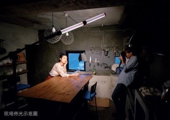 最后我们将拍摄场景转移到地下室另一侧的厨房餐桌。在这里我们要思考的是长方型餐桌范围较广,若单靠一支LED光棒可能无法达到我们要的补光效果,所幸这个问题可以透过手持式魔术光棒的“拼接”功能来解决,藉由两支持续光棒的组合,不仅可以使照射面积增加,同时也能利用光线因距离的递减性,使主体与环境背景有着显著的明暗交错,产生暧昧不明的戏剧光线感。