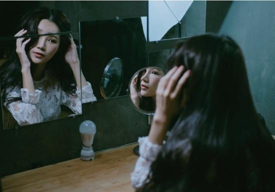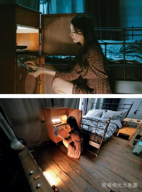 接着来到地下室的梳妆台前,我们发现这里的镜子有着很巧妙的配置,从某个角度(Model的左后方处)可以拍到两个镜中反射的Model。由于梳妆台右侧原本就有一盏用于照明的伪棚灯,因此我们决定直接在被摄者的左上方处架设一支LED光棒,并以近距离的方式补光,除了要压过伪棚灯的光线让Model左右脸颊有明暗对比之外,也试图营造出类似林布兰光的效果,使Model的五官能有更立体的呈现。而若换个方向来到Model的右前方,会发现从后方厨房延伸而来的暖色调光线,与梳妆台这侧的持续光色温不同,两种光线在画面中形成冷暖色调的对比,与在一楼扩大器前拍摄的影像有异曲同工之处,且在拍摄时,我们可以利用调整持续光的光线强弱,进而控制整体色温比重,让作品达到巧妙的和谐。