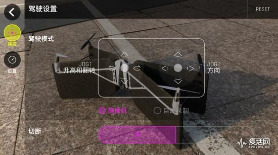 FreeFlight mini APP在完成与无人机连接之后,显示的界面非常简单。界面只有两个虚拟摇杆以及飞行姿态调节三个按钮,其中虚拟摇杆仍然按照美国手设计,左手控制飞行高度和原地旋转,右手控制油门和方向。上下滑动姿态调节按钮,则用来调整无人机与地面倾斜的角度,最终实现四轴无人机向固定翼无人机的转变。