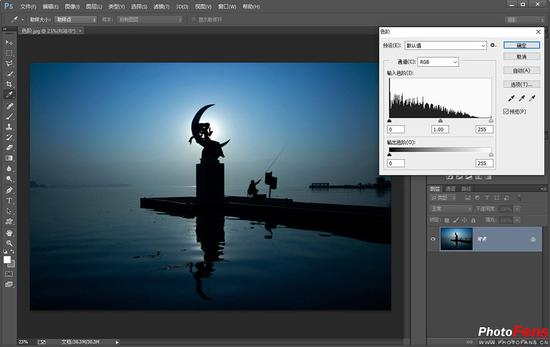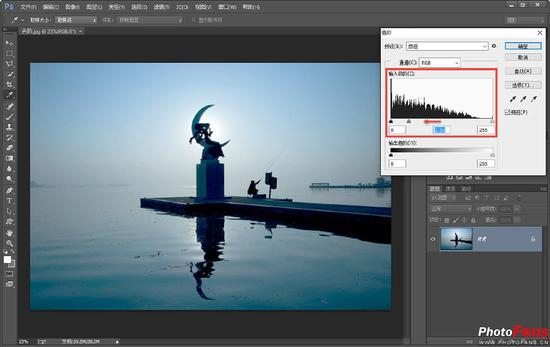 与“亮度/对比度”调整功能相比,利用“色阶”调整功能来进行高反差画面的优化会更好一些。具体操作也非常简单,调整直方图底部的中间灰调滑块即可。