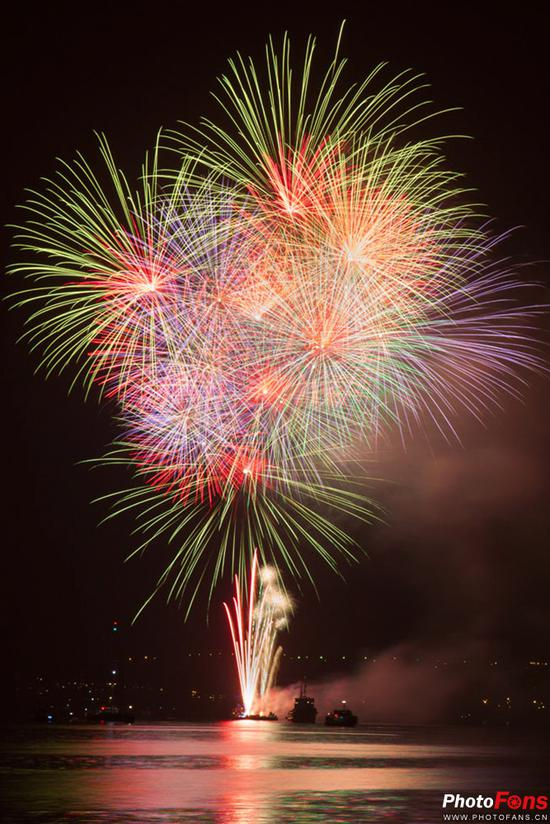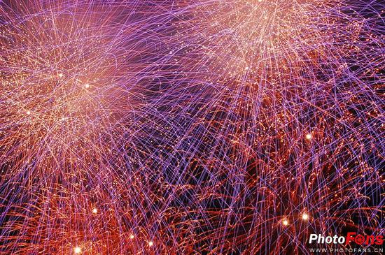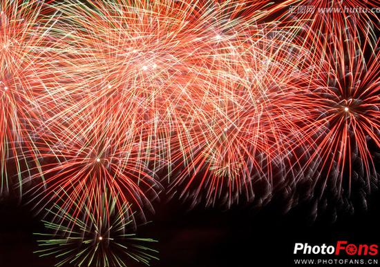 拍摄烟花最好发方式就是使用慢速快门来捕捉它绽放的那一过程,快门速度可设置在2秒-3秒左右,当然你也可以根据实际情况适当延长时间。但别将快门速度调整太快,以免拍出来的只是零零散散的火焰效果。或直接使用B门功能,只要你不松开快门,它就会一直打开,在烟花刚刚出现时按下快门,直到消失后再松开(通常要数秒钟)。也可以手动设置好快门速度,拍摄起来更简单。