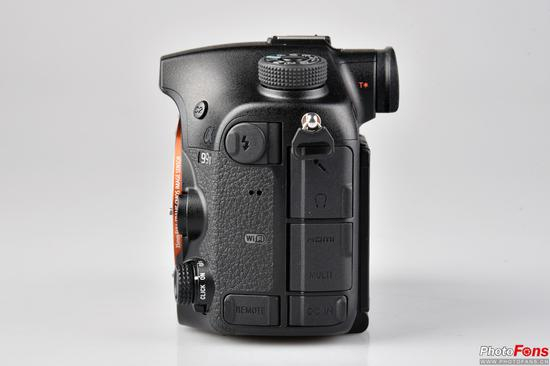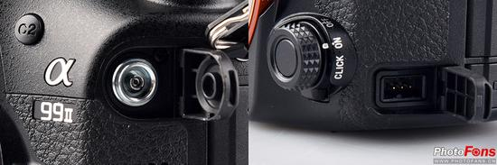 这两个接口分布于A99II机身右侧的顶部及底部,分别为外接闪光设备接口和遥控设备接口。