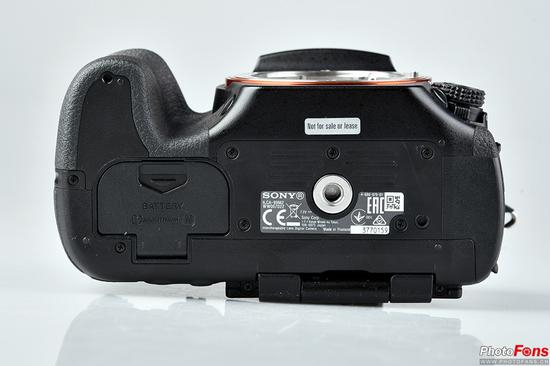 A99II机身底部是常规设计,电池仓和三角架安装孔。