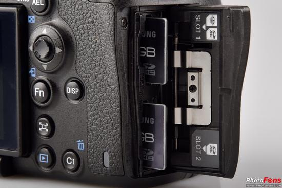 索尼A99II采用了双卡槽设计,分别支持SD/MS卡和SD卡。相同的数据可以同时存入两张卡,用户还可以选择分开存储RAW/JPEG文件和静态影像/动态影像。此外,还可以在两张存储卡之间复制数据。