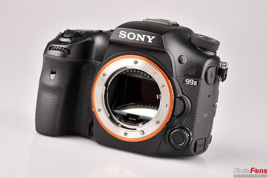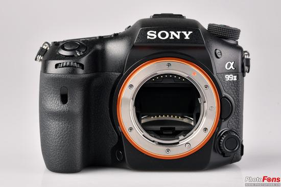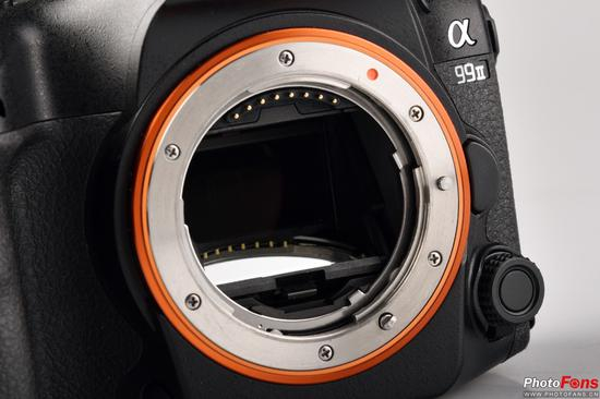 索尼A99II的机身正面可以看到A卡口占掉了不少的面积,手柄区域较为宽大,留给手指不少空间,握持感舒适。另外机身正面可以看到不少辅助性的按钮,在操作时能便利不少。