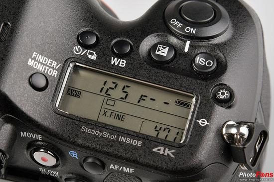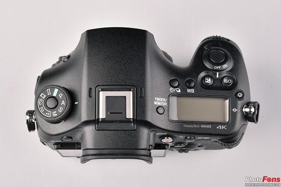 A99II机身顶部左侧是拍摄模式拨盘,而右侧是一个肩屏,能详细显示相机当前拍摄参数。围绕着肩屏的是一圈参数设置按钮,按钮位置设置比较合理,持机的右手食指能轻松的进行操作。这些按钮上也有做下凹处理,也是为了盲操作时能快速分辨出各个按钮。