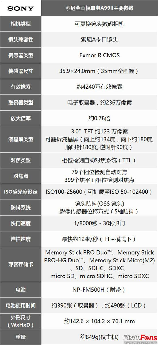 索尼A99II是一款内置约4240万有效像素35mm全画幅Exmor R CMOS背照式影像传感器的旗舰产品,拥有79个混合相位检测点和399个焦平面相位检测对焦点。感光度原生支持ISO 100-ISO25600,并且在静态照片模式可以扩展至ISO 50-ISO 102400。配合高速BIONZ X图像处理器和新开发的前端LSI,让连拍速度达到了最大12张/秒。