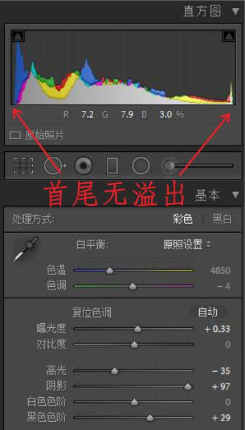 Raw文件的优势不仅仅在于16bit的色彩深度,更在于它超高的宽容度。通常,我会通过对曝光度,高光,阴影以及黑白色阶的组合调整来弥补前期拍摄相机曝光的缺陷,尽量让直方图如下图一样首尾没有溢出: