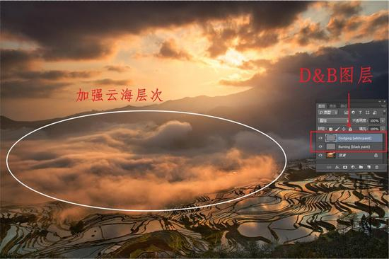 这一步至关重要,同时也很耗费时间,它将决定你照片的影调,层次,过渡以及氛围。简单的来说就是用加深减淡工具或者笔刷并且配合不同的前景色对照片进行提亮和压暗。(这张照片我用dodge&burn刻画出了云海的层次同时加强了云层的立体感)