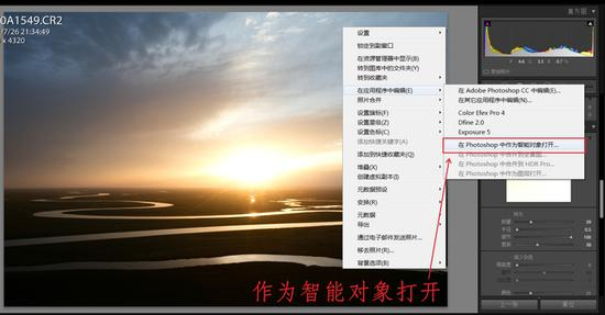 右键图片,选择“在photoshop中作为智能对象打开”,这样,图片就被导入到ps中了。作为智能对象打开的好处是在lr里对原始文件的调整如果不满意,可以直接双击图层在弹出的cameraraw滤镜面板进行修改,而这里的改动依旧是无损的。