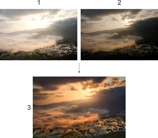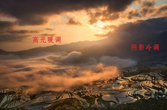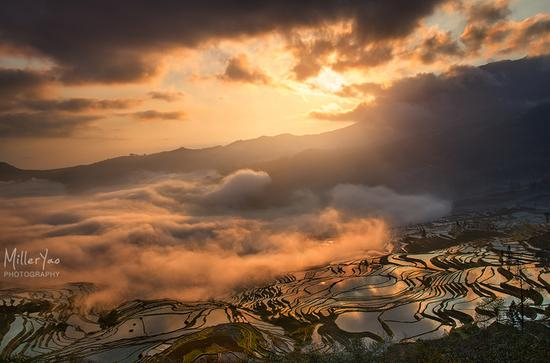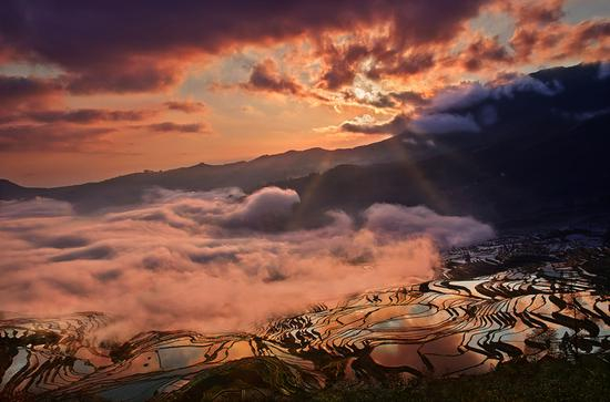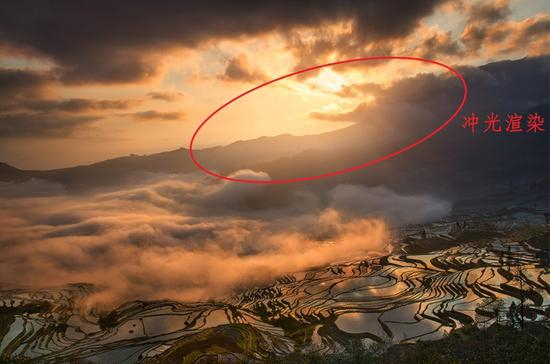这是我刚刚进阶风光摄影没多久在云南元阳拍摄到的梯田日出,上图是我重新后期以后的版本。而下图则是我4年前后期的版本: