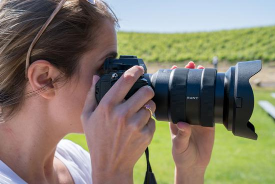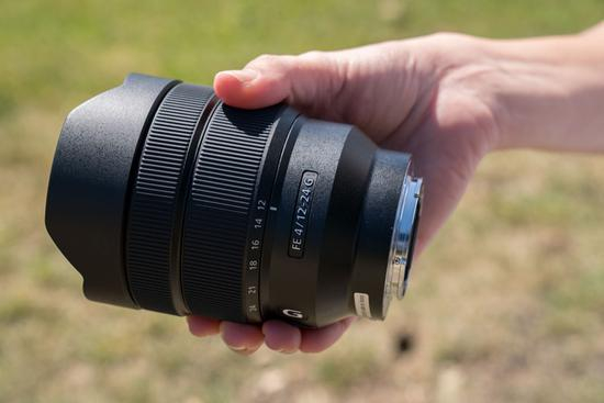 同样传承轻便、紧凑设计理念的还有新款12-24mm F4 G镜头。鉴于12-24mm F4的规格,新款12-24mm F4 G镜头的外观设计真的是非常小巧、紧凑,而在重量上,该镜头也能够与索尼全幅无反机身取得良好的平衡。