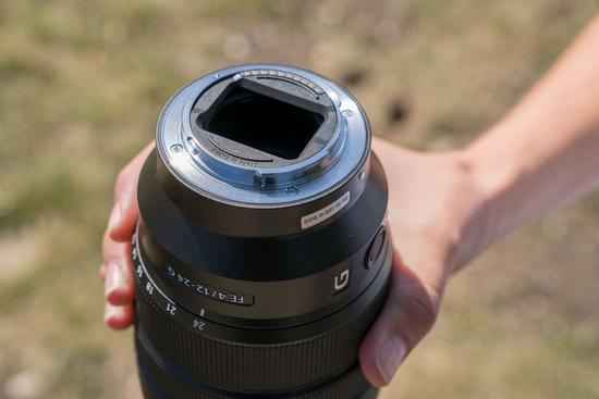 与FE 16-35mm F2.8 GM不同的是,12-24mm F4 G镜头的体积在变焦时并不会发生太大的变化,不过由于前镜组突出和配有不可拆卸的遮光罩,使得12-24mm F4 G镜头基本可以告别螺纹式滤镜了。