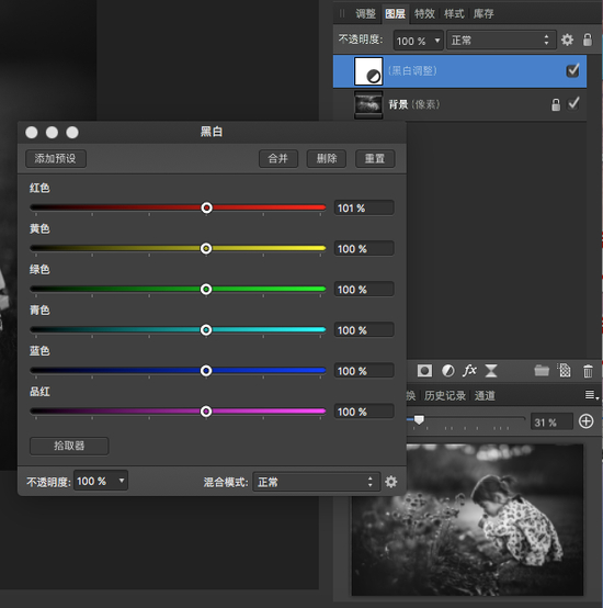这个时候图层旁会跳出黑白通道调整器,然后进行各项微调