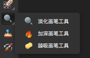 左侧工具竖条里“加深画笔工具”就好比我们的2B以上的铅笔进行加深细化,而“淡化画笔”就相当于橡皮泥去做削弱减法加亮。