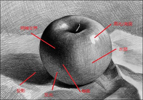以一个苹果为例,各区域对应了黑白的视觉传达效果