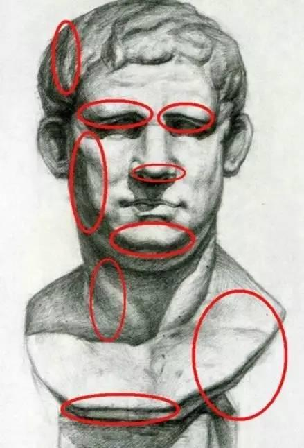图中红色椭圆便是石膏像阿格里巴的面部明暗交界线,是在素描后期排线、绘画时的重要交代处理区域。