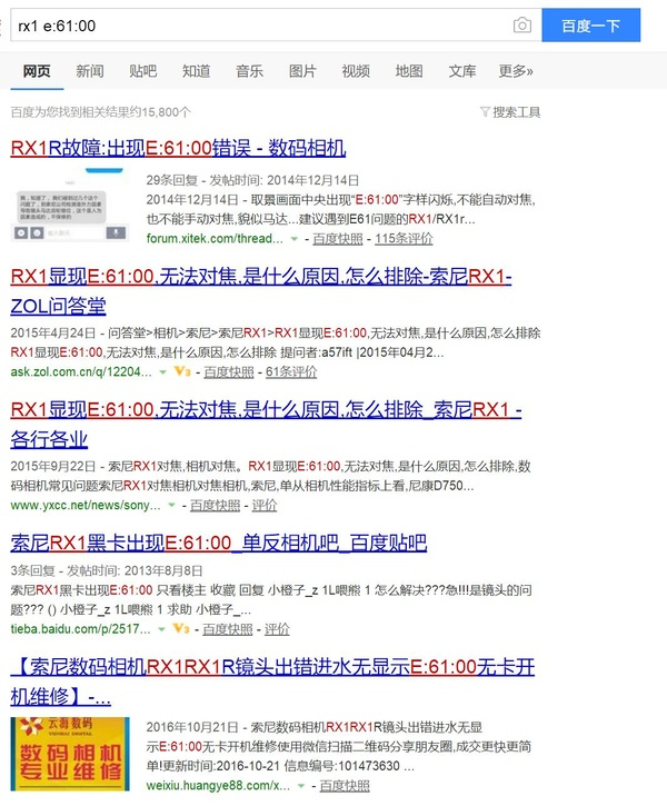 然后网上搜索发现,从RX1开始,弹出E:61:00故障码的问题就有很多人反映,看来杯具的不止我一个啊。RX1R也有不少人在网上吐槽,大家出现的情况也比较类似,有些是进水、摔过、有些就和我一样无缘无故就出现E:61:00提示的。症状都是可以拍照但不能对焦。外观上没有一点问题。没想到这个突然出现的故障码居然还是个通病。而且有些人用了几个月就有这样的问题了。我一开始觉得他们好杯具,后来想想我这种才杯具啊。人家几个月坏掉的还有保修可以送修啊,我要是送修就要自己掏钱了。