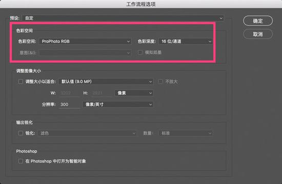 色彩空间设置为“ProPhoto RGB”,色彩深度设置为“16位/通道”。这样以后照片从ACR进入Photoshop后,PS会自动使用16位ProPhoto进行编辑。