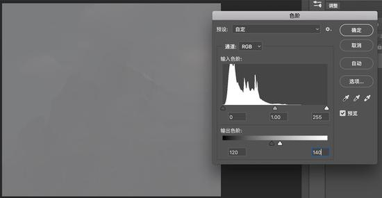首先把色阶中的输出色阶设置为120、140,极大的减少图片对比度。