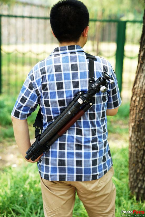 肩带方面做的比较宽大,背上之后重量分布均匀,没有明显的不平衡感。而肩带也可以直接绑在脚架上,方便了远足时可以随时取用而又不会占用一只手。云台方面也很用心的配备了一个布袋,方便了收纳。