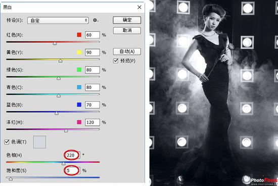 (8)黑白层次对比效果形成,勾选“色调”,设置“色相”值为220°,“饱和度”值为5%,浅浅地铺上一层淡蓝灰,效仿黑白照片冲洗出来的效果;也可以在“色调”旁边的色块上单击打开“拾色器(色调颜色)”对话框,来进行颜色的设定,如图所示,然后单击“确定”按钮实现效果。