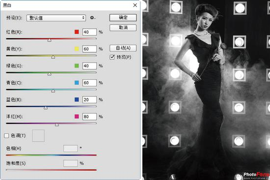 (4)在弹出的“黑白”对话框中,多个颜色选项分别由RGB与CMY组成,也就是光源和颜料的原色,基本涵盖了彩色画面中的所有色彩,除了“预设”的“默认值”选项,菜单中还有其他多个“滤镜”效果供选用。另外,这里提供的“色调”选项,可以用于改变色相与饱和度,而不只停留在黑白的效果上,可基于黑白再创造出其他多种单色色调,如图所示。